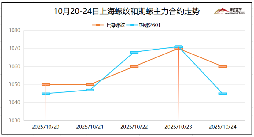 (2)本周多空激烈博弈,雙方意見(jiàn)分歧較大,倉(cāng)位掌控調(diào)換頻繁,盤(pán)面低位起伏搖擺。周一至周四,期螺合約震蕩微漲,截至本周五,盤(pán)面走勢(shì)掉頭下挫,接近周初合約點(diǎn)位。截至10月24日,螺紋2601主力合約報(bào)在3045,周環(huán)比上漲8。
