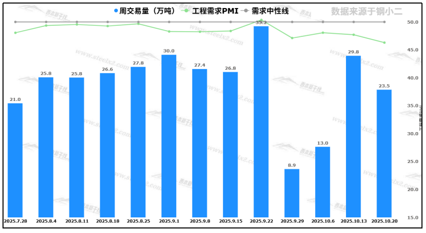 隨著冷空氣東移南下,全國(guó)大部降溫明顯,西北、東北等地氣溫僅個(gè)位數(shù),華北多地入冬體感,江南一帶則全面入秋,可見(jiàn),北方地區(qū)逐步放緩,南方需求緩慢回升。據(jù)鋼小二跟蹤數(shù)據(jù)顯示,截至周五下午15點(diǎn),本周采樣全國(guó)工程需求量23.5萬(wàn)噸。