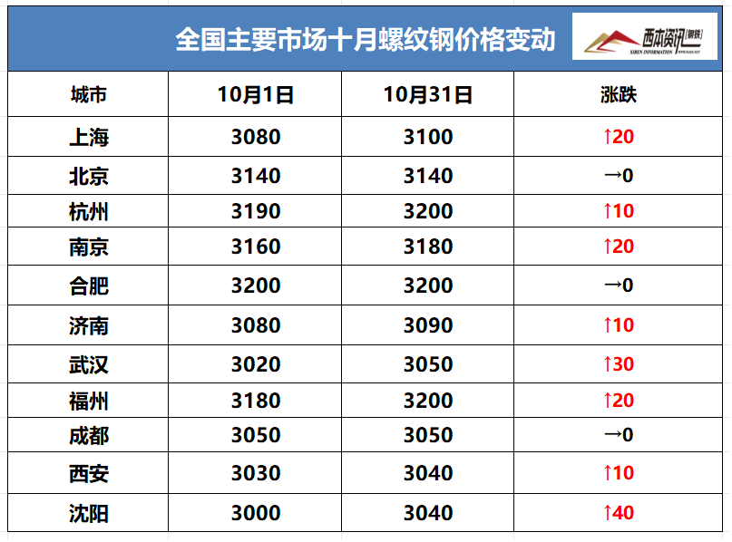 據(jù)西本資訊跟蹤的數(shù)據(jù)顯示,截止10月30日,唐山地區(qū)普碳方坯出廠價格2980元/噸,較上月同期上漲30元/噸;江蘇地區(qū)廢鋼價格為2110元/噸,較上月同期上漲50元/噸;山西地區(qū)一級焦炭價格為1330元/噸,較上月上漲100元/噸;澳大利亞61.5%粉礦青島港價格為801元/噸,較上月同期上漲23元/噸。