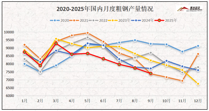 從鋼廠生產(chǎn)情況來看,國家統(tǒng)計局數(shù)據(jù)顯示,2025年9月,中國粗鋼產(chǎn)量7349萬噸,同比下降4.6%;生鐵產(chǎn)量6605萬噸,同比下降2.4%;鋼材產(chǎn)量1.24億噸,同比增長5.1%。1-9月,中國粗鋼產(chǎn)量7.46億噸,同比下降2.9%;生鐵產(chǎn)量6.46億噸,同比下降1.1%;鋼材產(chǎn)量11.04億噸,同比增長5.4%。