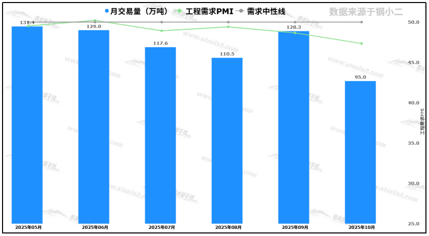 國慶節(jié)后歸來,建筑鋼材受期貨盤面下跌,以及全國天氣降溫明顯,北方局部雨雪天氣,終端采購節(jié)奏放緩,表觀需求低于往年同期。10月下旬,期貨盤面震蕩回升,市場情緒偏暖,需求釋放緩慢回升。即將步入11月,受冷空氣進一步侵襲,北方需求將進一步收縮,南方大部正常施工。據(jù)鋼小二平臺采樣數(shù)據(jù)顯示,10月份螺紋鋼需求指數(shù)月環(huán)比下降25%。