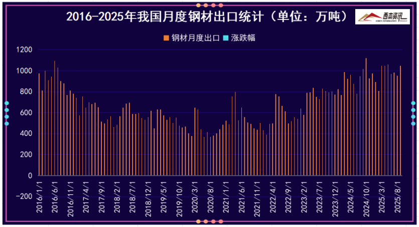 海關(guān)總署數(shù)據(jù)顯示,2025年9月份中國出口鋼材1046.5萬噸,較上月增加95.5萬噸,環(huán)比增長10.0%;1-9月份累計出口鋼材8795.5萬噸,同比增長9.2%。9月份中國進口鋼材54.8萬噸,較上月增加4.8萬噸,環(huán)比增長9.6%;1-9月份累計進口鋼材453.2萬噸,同比下降12.6%。
