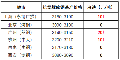截至午間,國(guó)內(nèi)部分市場(chǎng)螺紋鋼(抗震)基價(jià)如下:上海市場(chǎng)3180-3190元/噸;北京市場(chǎng)3090-3100元/噸;廣州市場(chǎng)3140-3150元/噸;杭州市場(chǎng)3200-3210元/噸;南京市場(chǎng)3170-3180元/噸;西安市場(chǎng)3100-3110元/噸。環(huán)比來(lái)看,截至上午收盤(pán),全國(guó)主要市場(chǎng)一線品牌價(jià)格有穩(wěn)有升。
