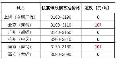 截至午間,國(guó)內(nèi)部分市場(chǎng)螺紋鋼(抗震)基價(jià)如下:上海市場(chǎng)3180-3190元/噸;北京市場(chǎng)3100-3110元/噸;廣州市場(chǎng)3140-3150元/噸;杭州市場(chǎng)3200-3210元/噸;南京市場(chǎng)3180-3190元/噸;西安市場(chǎng)3100-3110元/噸。環(huán)比來(lái)看,截至上午收盤(pán),全國(guó)主要市場(chǎng)一線品牌價(jià)格穩(wěn)中略升。