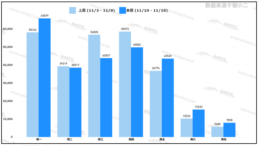 據(jù)鋼小二平臺樣本數(shù)據(jù),11月14日采樣全國工程需求量為43,549噸,環(huán)比上個交易日下降12%。