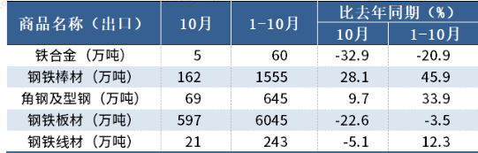10月,中國(guó)出口鋼鐵棒材162萬(wàn)噸,同比增長(zhǎng)28.1%;1-10月累計(jì)出口1555萬(wàn)噸,同比增長(zhǎng)45.9%。其他出口情況如下表所示: