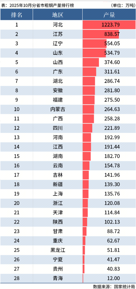 國(guó)家統(tǒng)計(jì)局?jǐn)?shù)據(jù)顯示,2025年10月中國(guó)粗鋼產(chǎn)量7199.7萬噸,同比下降12.1%;1-10月累計(jì)粗鋼產(chǎn)量81787.4 萬噸,同比下降3.9%。