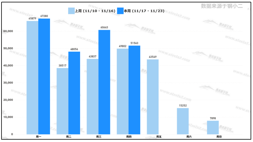 據(jù)鋼小二平臺樣本數(shù)據(jù),11月20日采樣全國工程需求量為51,563噸,環(huán)比上個(gè)交易日下降15%。