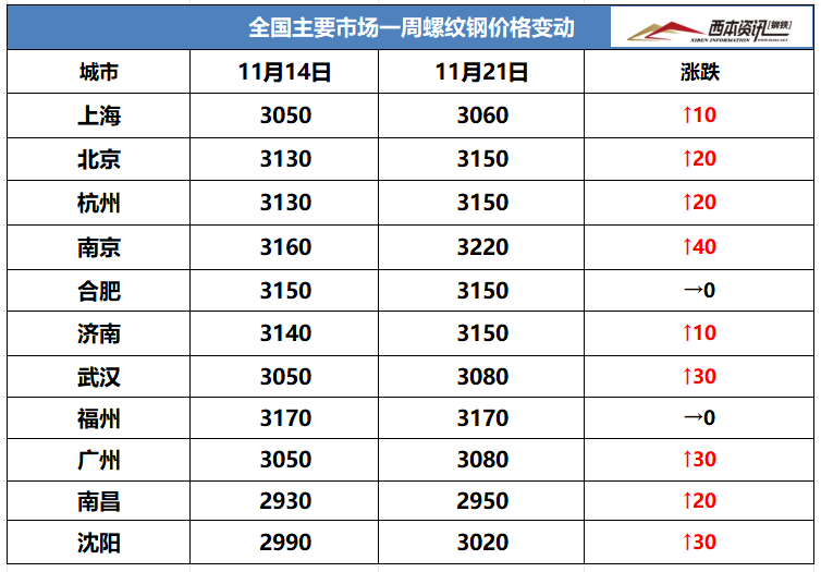 (1)上周國(guó)內(nèi)建筑鋼材行情窄幅整理,截至11月21日,西本指數(shù)報(bào)在3420,周環(huán)比上漲20。