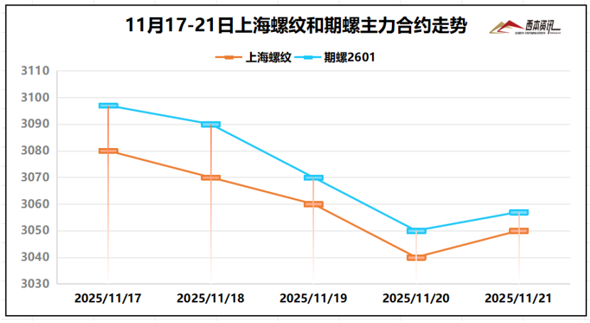 (2)周初,期螺2601合約前期超跌反彈,市場(chǎng)情緒一度轉(zhuǎn)暖;周二至周四,空頭打壓勢(shì)力增強(qiáng),盤面連續(xù)弱勢(shì)下挫,現(xiàn)貨交易放緩,長(zhǎng)流程鋼企虧損面擴(kuò)圍,市場(chǎng)操作表現(xiàn)謹(jǐn)慎。截至11月21日,螺紋2601主力合約報(bào)在3057,周環(huán)比上漲4。