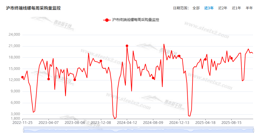 本期,西本資訊監(jiān)測(cè)的滬市線螺周終端采購量為1.91萬噸,周環(huán)比減少1.55%(見下圖)。本周終端需求環(huán)比波動(dòng)較小,顯示剛需依然平緩。