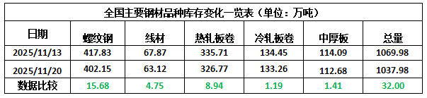 據(jù)西本資訊歷史數(shù)據(jù),當(dāng)前庫存總量較上年同期(2024年11月21的807.88萬噸)增加230.10萬噸,增幅為22.17%。分品種看,本期五大鋼材品種庫存中,所有品種降庫。(見下圖)